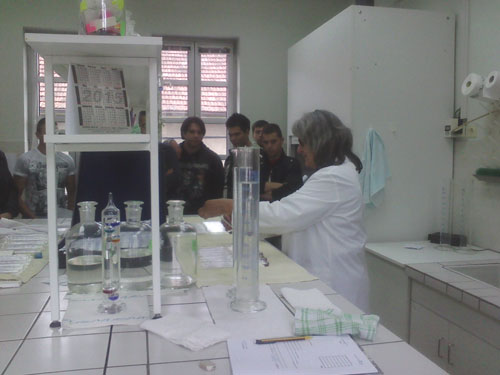 Након упознавања са организационом шемом Дирекције и приказивања промотивног филма о раду Дирекције, стручна посета је настављена обиласком лабораторија. У лабораторији за физичко-хемијска мерила студентима је демонстрирано оверавање ареометара за мерење густине и квалитативна анализа предмета од драгоцених метала. На крају, студенти су добили одговоре на бројна питања у вези употребе и начина провере исправности мерила која се користе у свакодневном животу.