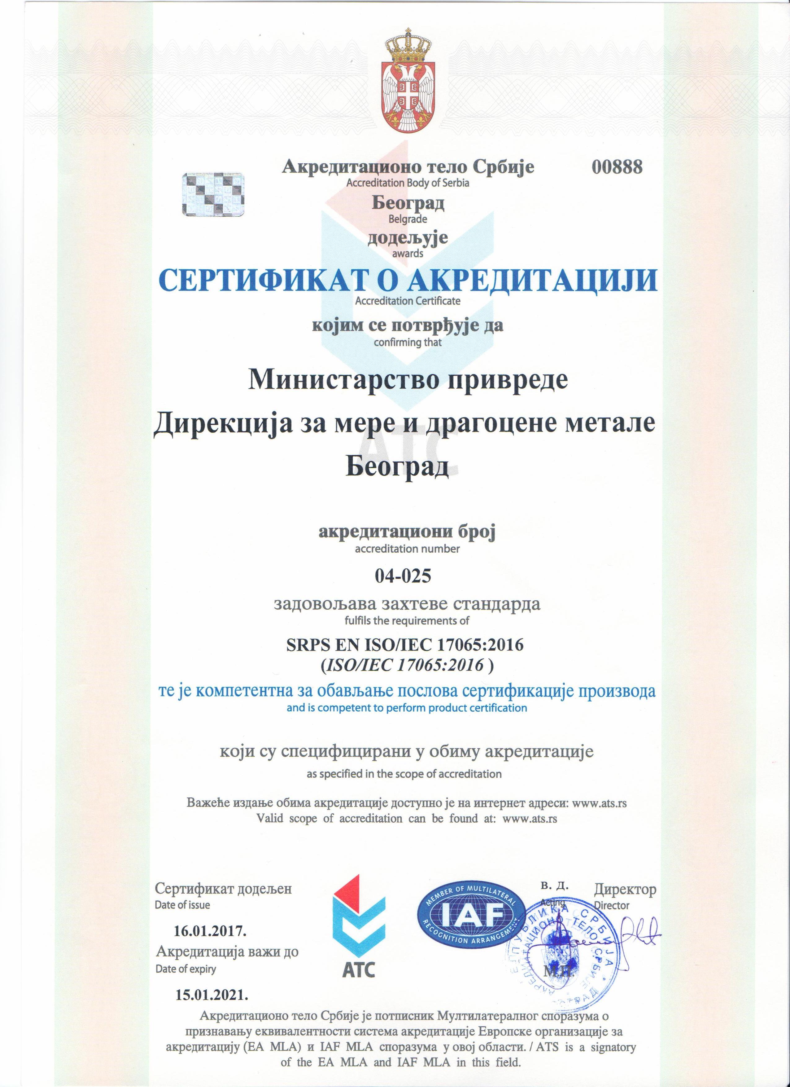 Акредитационо тело Србије (АТС) доделило је акредитацију Сертификационом телу Дирекције за мере и драгоцене метале за послове оцењивања усаглашености. Обим акредитације Сертификационог тела Дирекције за мере и драгоцене метале према стандарду SRPS EN ISO/IEC 17065:2016 је испитивање типа: вага са неаутоматским функционисањем, бројила активне електричне енергије и таксиметара.