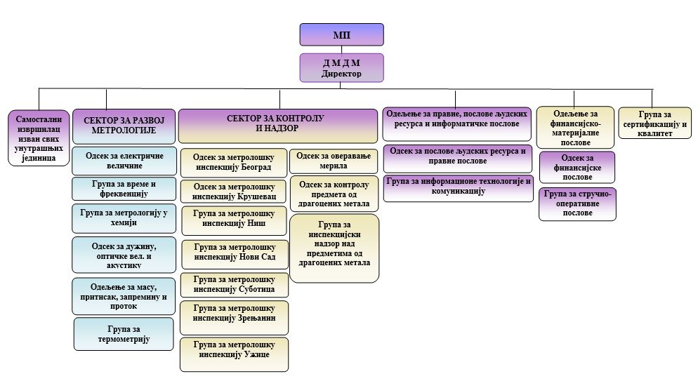 Za obavljanje poslova iz delokruga Direkcije za mere i dragocene metale, obrazuju se sledeće osnovne unutrašnje jedinice:
