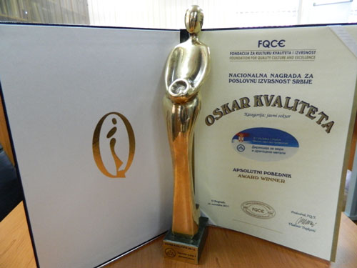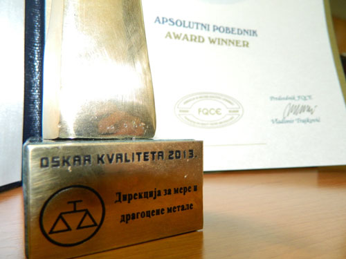 The Foundation for Quality Culture and Excellence - FQCE in cooperation with the Serbian Chamber of Commerce and supported by the Ministry of Economy - the ministry responsible of quality infrastructure on World Quality Day on Thursday, November 14, 2013 , in the Serbian Chamber of Commerce, as part of the "Forum of quality and business excellence in 2013", 19th time in a row awarded the prestigious award for business excellence "Quality Oscar " in 2013 for outstanding results achieved in the improvement and development of quality and business excellence in the country and the region. An independent jury, after having conducted an evaluation, selected the Directorate of Measures and Precious Metals, which in 2013 achieved some excellent results on developing and improving the quality of business excellence in Serbia.