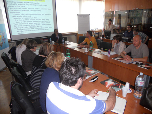 During the visit, was organized a two-day training workshop on “Organization, implementation and statistical evaluation of PT schemes based on the standard ISO 17043”. Training was attended by representatives of the Accreditation Body of Serbia, NIS-Naftagas, PUC Belgrade power plants, Institute of meat hygiene and technology from Belgrade, Agency for environmental protection, Faculty of Pharmacy, Belgrade, Institute for food technology, Novi Sad, as well as representatives of the Directorate of Measures and Precious Metals. Trainers were Dr. Tin Win and Mrs. Jelena Bebić from Directorate of Measures and Precious Metals.