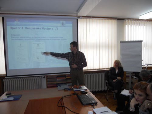 The coordinator of the seminar Branka Radanov, M.Sc., welcomed the guests on behalf of the Directorate of Measures and Precious Metals and on behalf of the Regional Chamber of Commerce Valjevo the meeting was opened by Vice-President of the Chamber, Mr. Petar Nikolić. Seminar was aimed at introducing the target group with the Regulation and registration of packers and importers from Valjevo district. Seminar was realized to include the theoretical and practical parts (workshop and guidelines to packers). Speakers were a team from the Directorate: Branka Radanov, M.Sc., Ljiljana Mićić, Tamara Kalinić, Dušan Jovanović, Boško Stefanović, Aleksandar Kostić, and Ruža Krajninger-Vuković.