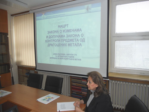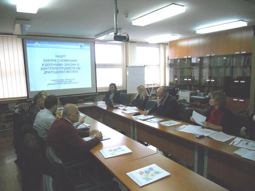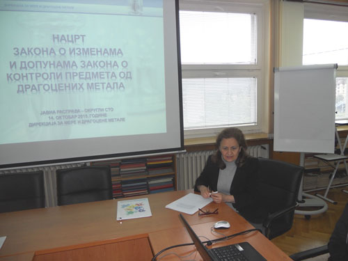 At the beginning of the public debate Mrs. Vida Živković, M.Sc., Director of Directorate of Measures and Precious Metals, welcomed the members of the Round table and gave introductory word. Mrs. Vanja Radojević Milošević, Head of Department for legal and general affairs, by her presentation explained the reasons for the adoption of a new law, as well as with the most important inovations that this law brings, after which it moved to the discussion of those present.