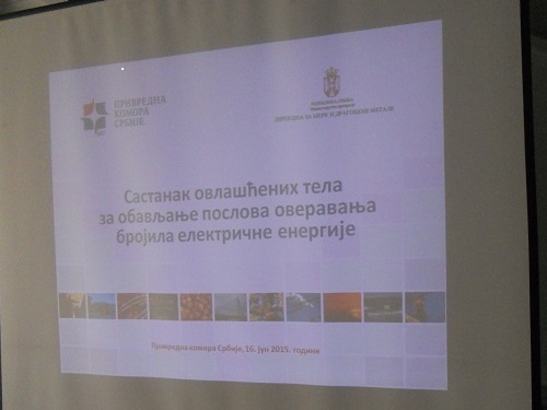 Directorate of Measures and Precious Metals together with the Group for Metrology in Association of accredited conformity assessment bodies of Serbian Chamber of Commerce held on June 16, 2015, meeting of the authorized bodies for performing verifications of electricity meters, in the Chamber of Commerce of Serbia in Belgrade.