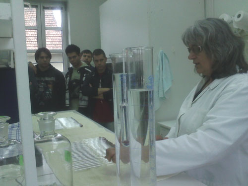 After getting acquainted with the organizational chart of DMDM and screening a promotional film about the work of the Directorate, expert visit continued a tour of the laboratories. In the laboratory for physico-chemical measuring instruments to students was demonstrated verification of hydrometers for measuring density and quality analysis of precious metals articles. Finally, the students were given answers to many questions regarding the use and ways of correctness checking of measuring instruments that are used in everyday life.