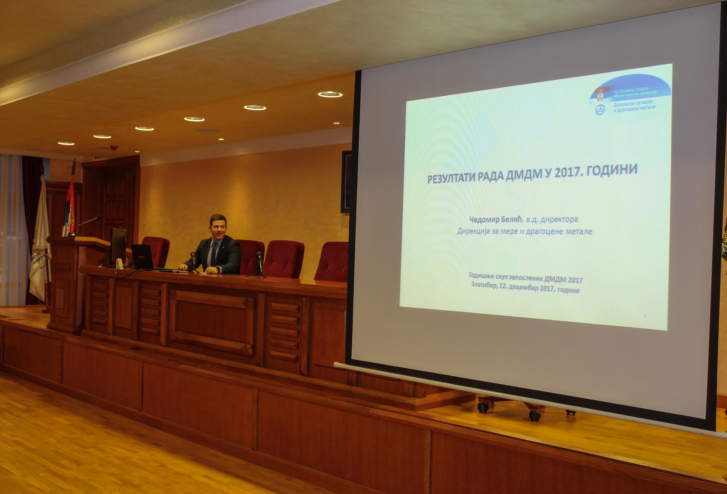 Annual Gathering of Directorate of Measures and Precious Metals (hereinafter DMDM) was held on December 22, 2017 in premises of Romania Congress Center of Student Resort “Ratko Mitrović”. Annual Gathering attended employees from organizational units from Belgrade, Novi Sad, Zrenjanin, Subotica, Niš and Kruševac.
