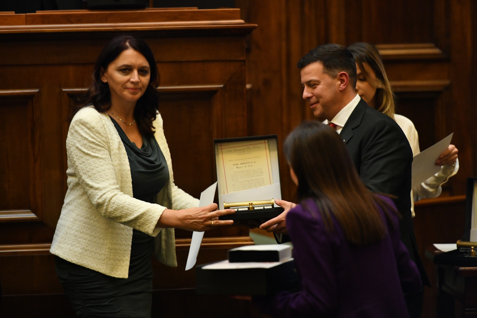 At the very end of the ceremony, director Belic thanked all those present and presented certificates of appreciation for successful cooperation and contribution to the work of DMDM to the Minister of Science, Technological Development and Innovation, Dr. Jelena Begovic, to the Institute for Nuclear Sciences "Vinca", to the director of the Institute for Standardization of Serbia, Tatjana Bojanic, to the director of the Accreditation bodies of Serbia M.Sc. Dragan Pusara, director of the Personnel Management Service, prof. Dr. Danilo Roncevic, director of the Museum of Science and Technology Zoran Levic, general director of AD Insa Jovica Zaric, acting director of JP "Post Serbia" Zoran Djordjevic, director of RJ "Srbijamarka" of Post Serbia Dr. Adam Sofronijevic, former directors of DMDM M.Sc. Dragan Milosevic, Dr. Jelena Pantelic Babic and M.Sc. Vida Zivkovic, as well as directors of national metrology institutes from the region, M.Sc. Milica Ristovic Krstic, Gordana Bajic and Paun Ilchev.