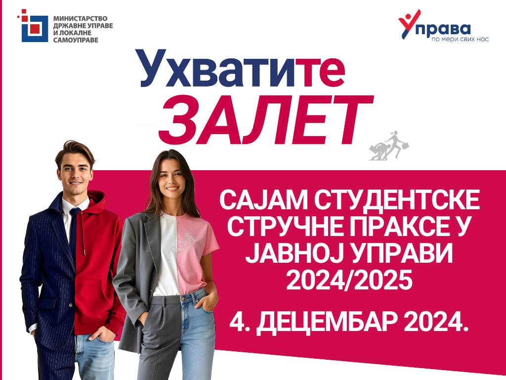 Ovogodišnji, četvrti po redu, onlajn Sajam studentske stručne prakse u javnoj upravi, pod sloganom „Uhvatite zalet“, održaće se 4. decembra 2024. godine, sa početkom u 10 časova, na posebno dizajniranoj onlajn platformi u obliku virtuelizovane Palate Srbija, kao jednog od najznačajnijih arhitektonskih zdanja naše državne administracije.